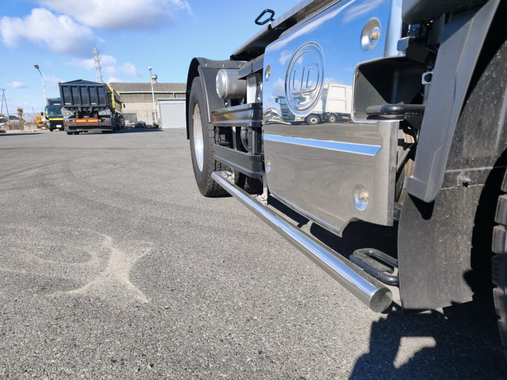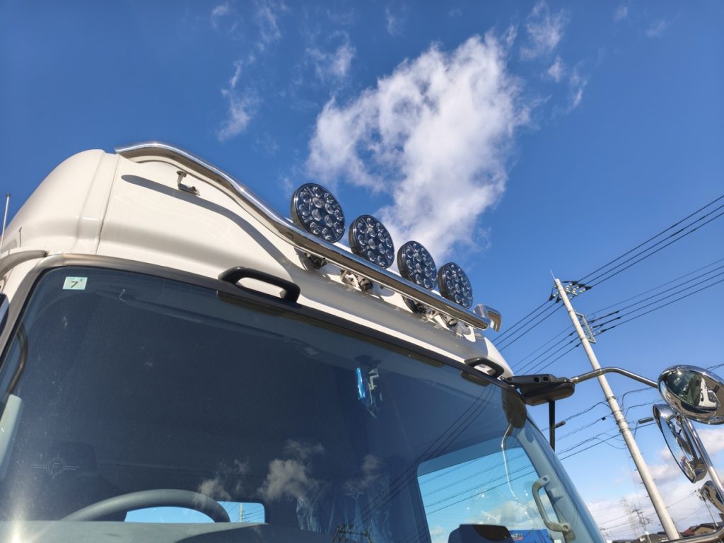 こちらはもう販売済みだけど国産のカスタムライン、フライングエレファントのUDカスタム。まずバーがFEオリジナルなのね。60φの極太パイプをきっちり整形。さらにジャンボの樽型フォグを合わせる。UDには絶対コレ!ってぐらい合ってる。アルのセンスが光ってるのよ。これが基本で、ここからサイドバンパー付けたり、サイドのエアロ付けたり、もうガチのユーロ!? ってぐらいまで行っちゃえる。